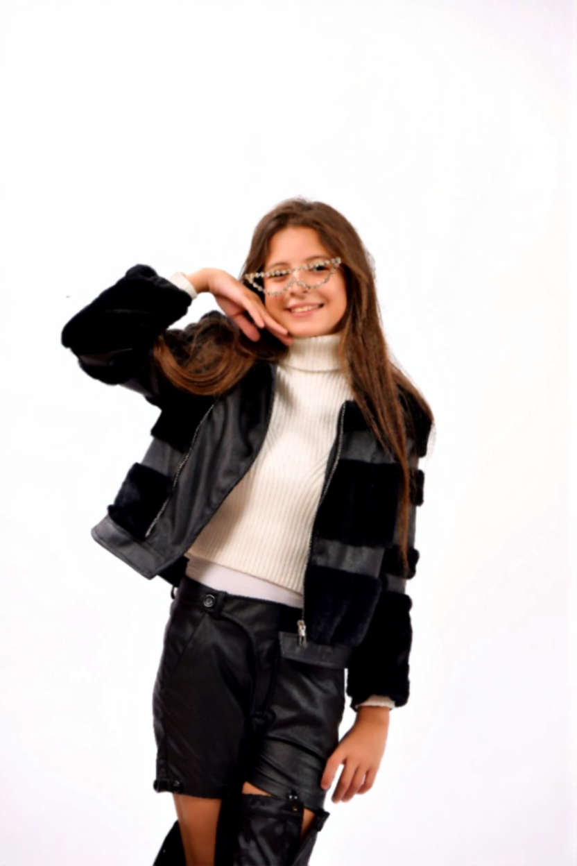 A stylish black faux-fur and leather-mix jacket featuring bold striped texture and a modern zip-up design. Warm, trendy, and perfect for giving girls a sleek winter look with attitude.